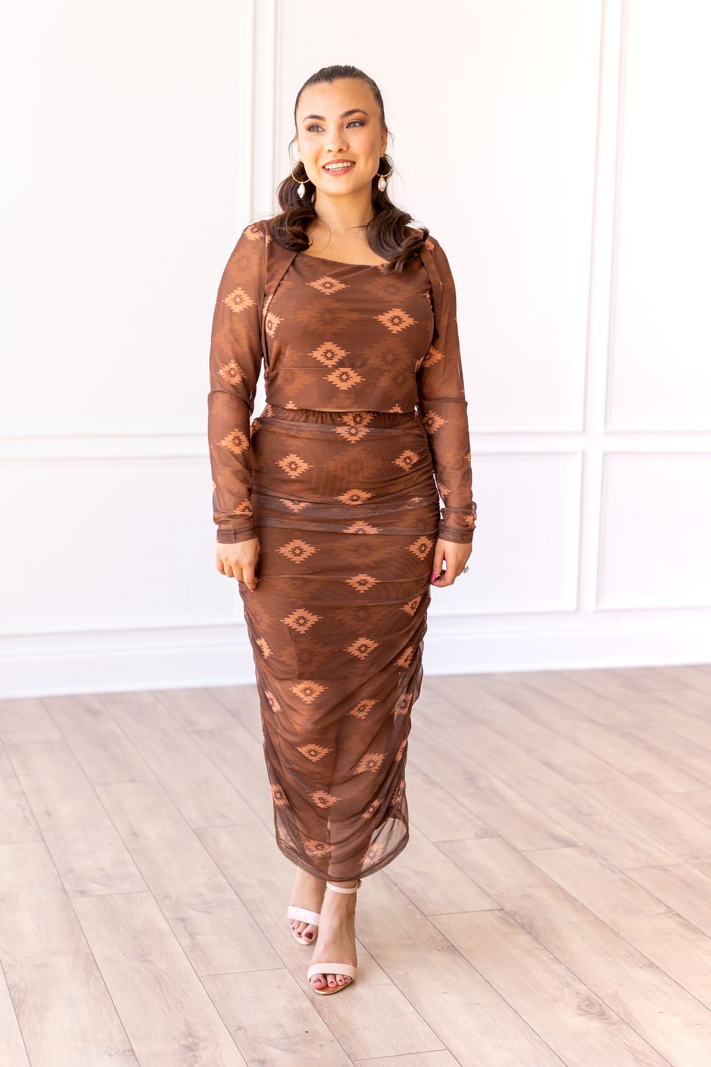 The Copper Canyon Aztec Mesh Top features bold serape or Brown Aztec colors, adding a playful touch to its classic silhouette. Crafted from breathable mesh, it keeps you cool and stylish on hot days. Pair it with jeans for a casual look or wear it as a set for a coordinated style.