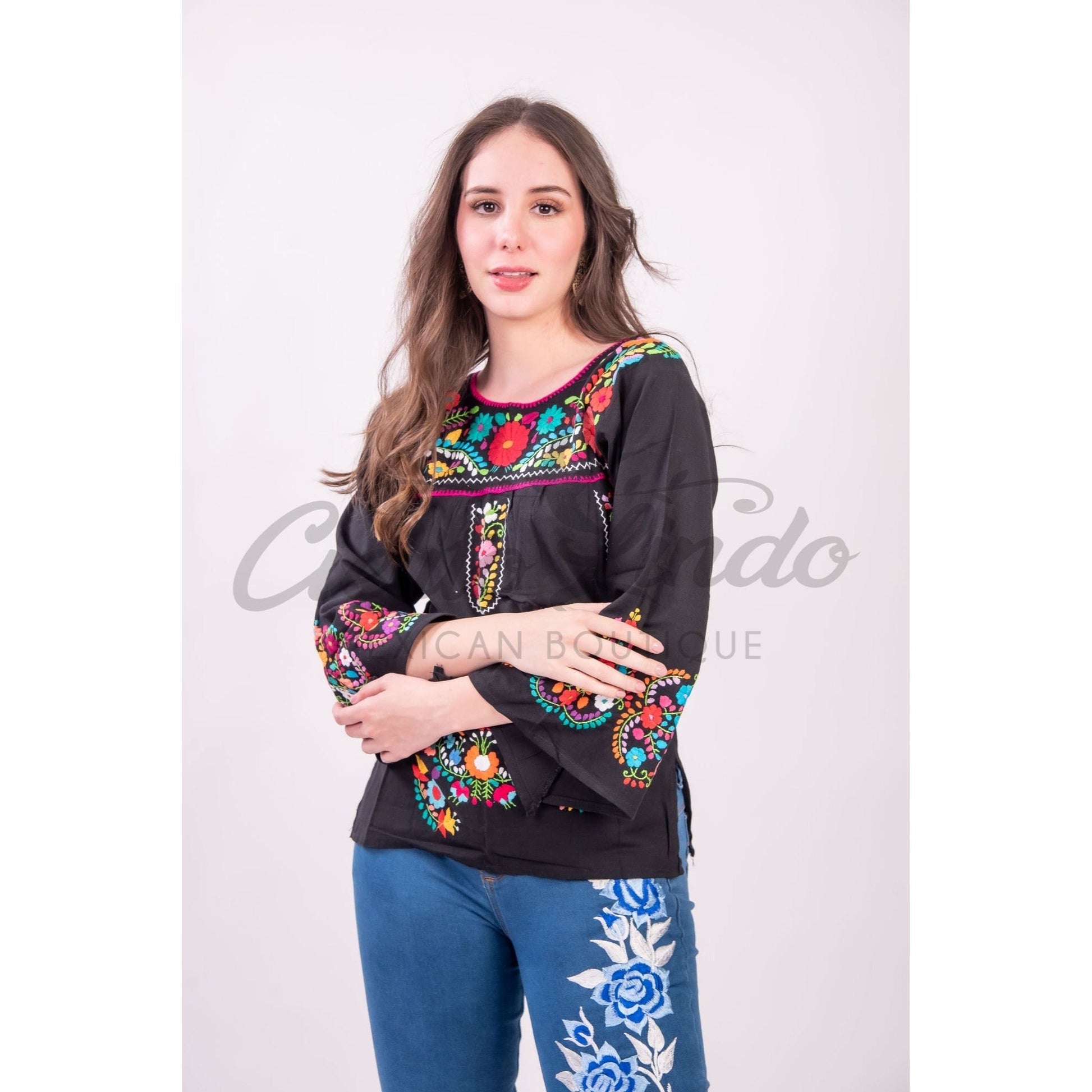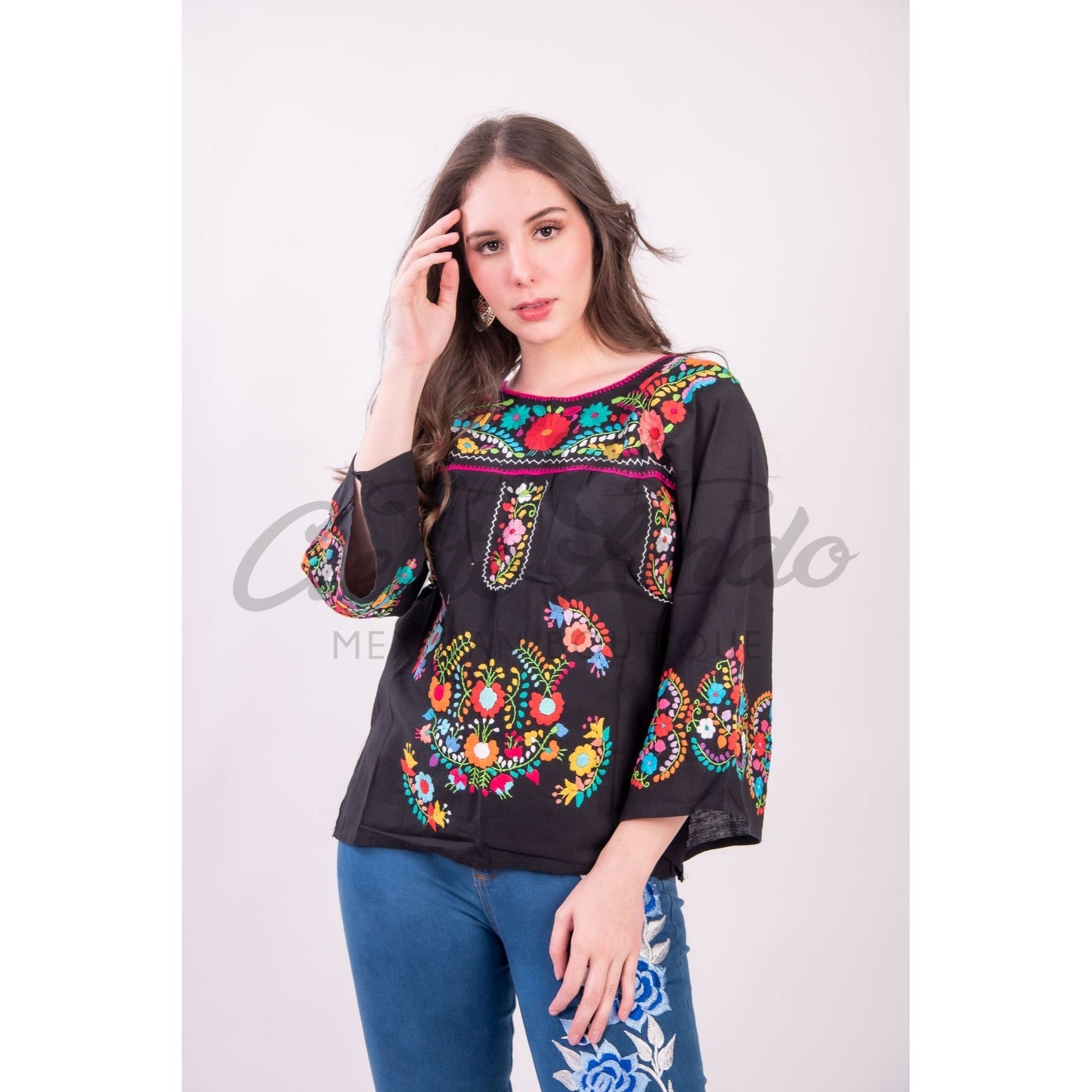 Made by skilled artisans in Oaxaca, it boasts intricate floral embroidery in a variety of colors, adding a touch of elegance to its timeless design.