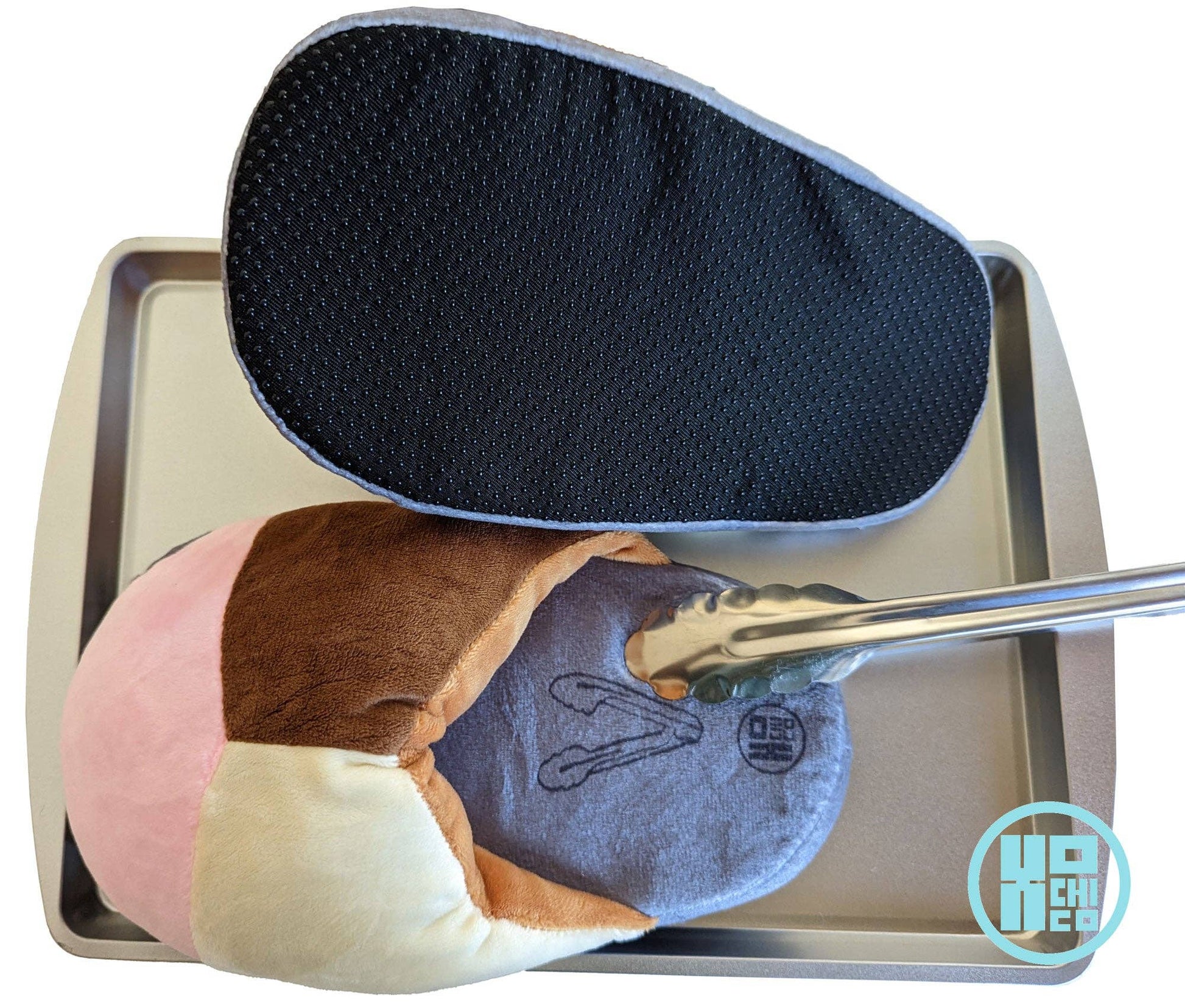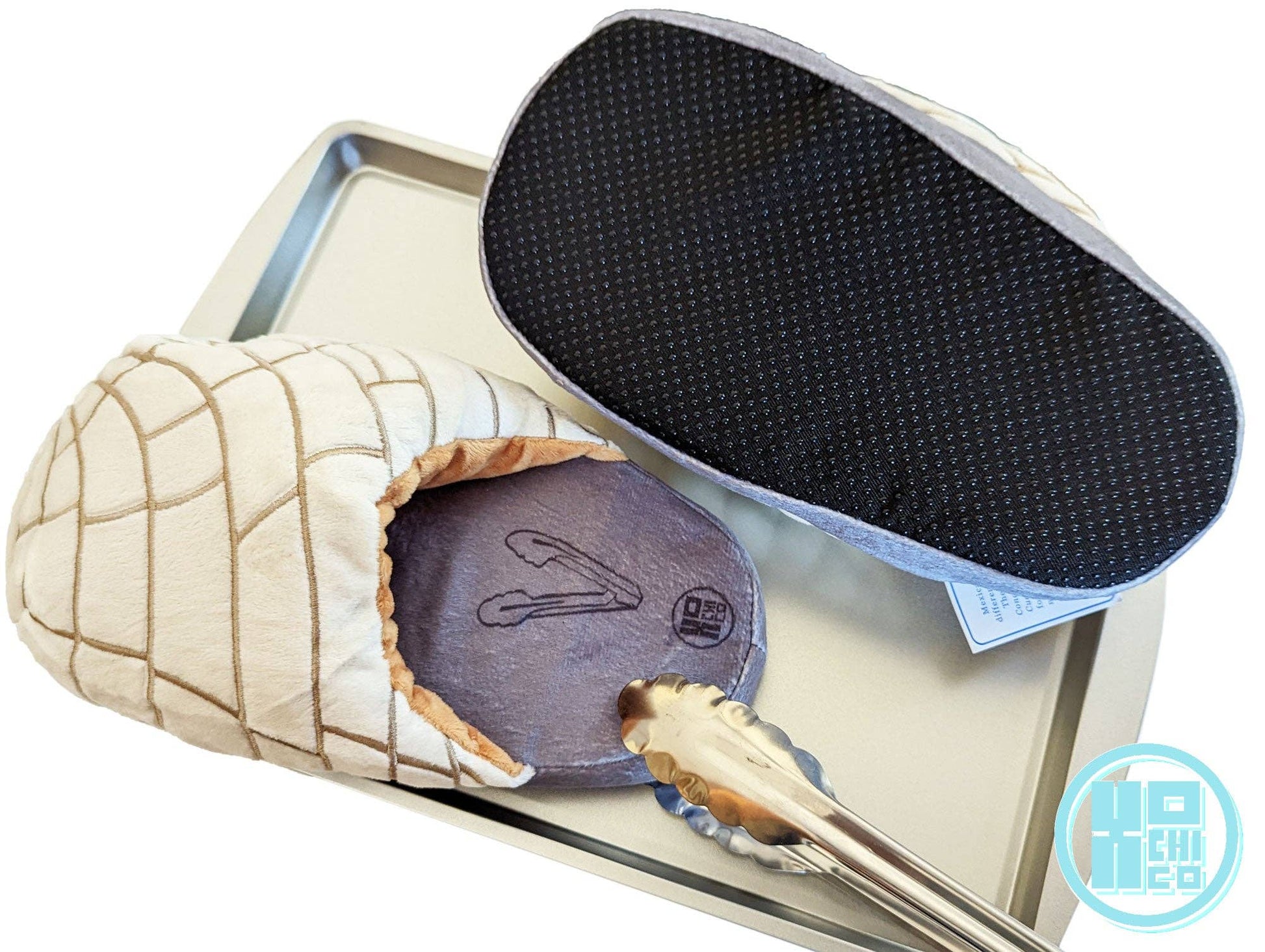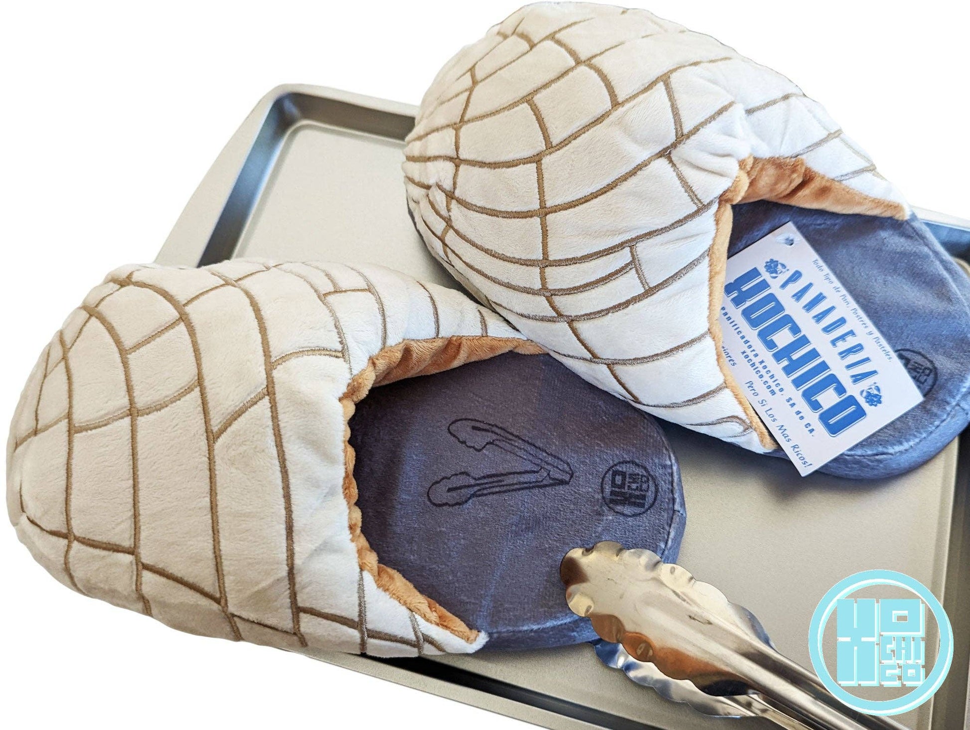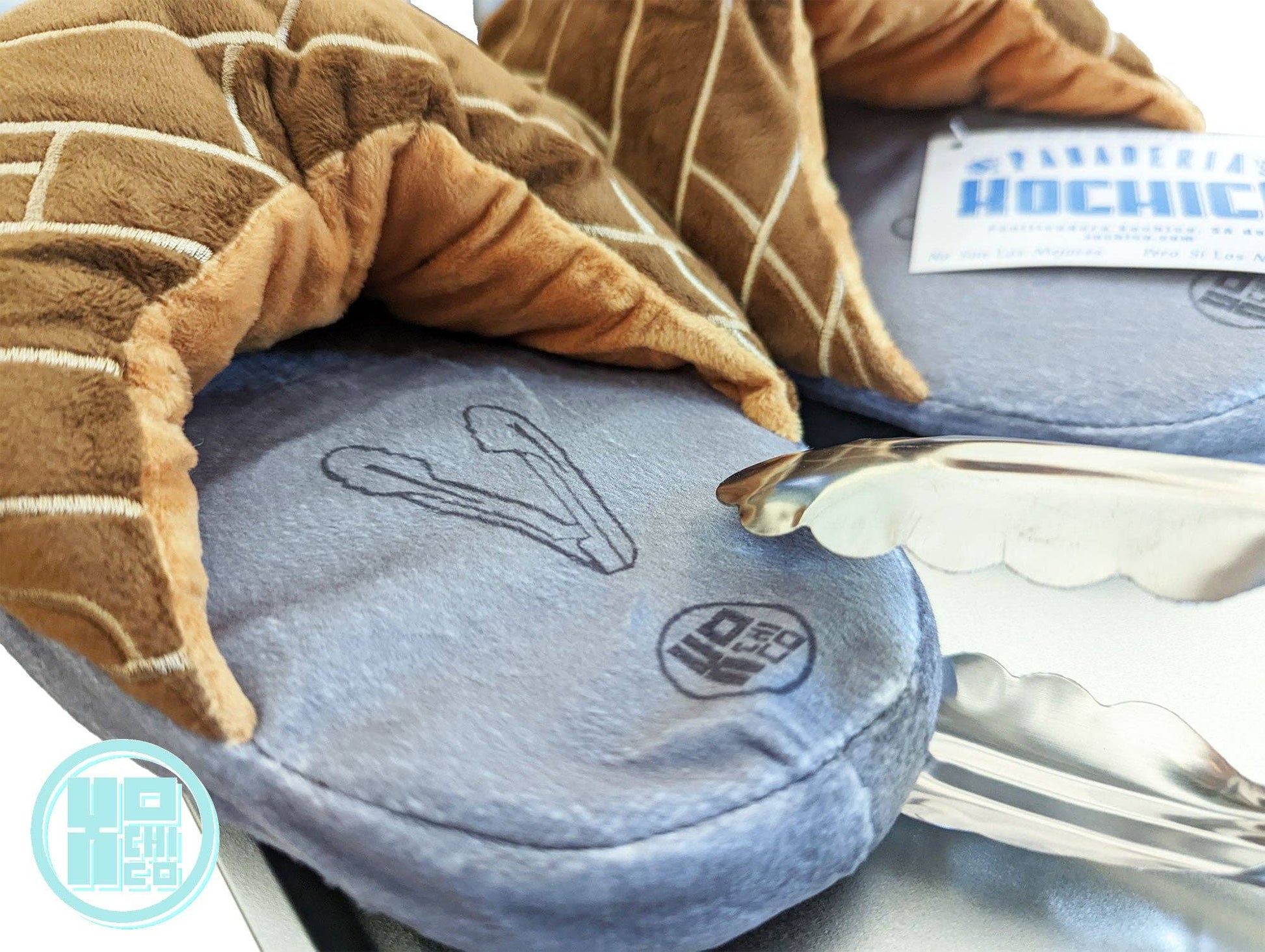 Plush top layer in the form of popular pan dulce on top of a gray "charola" baking tray with a "tenazas" (tongs) print.