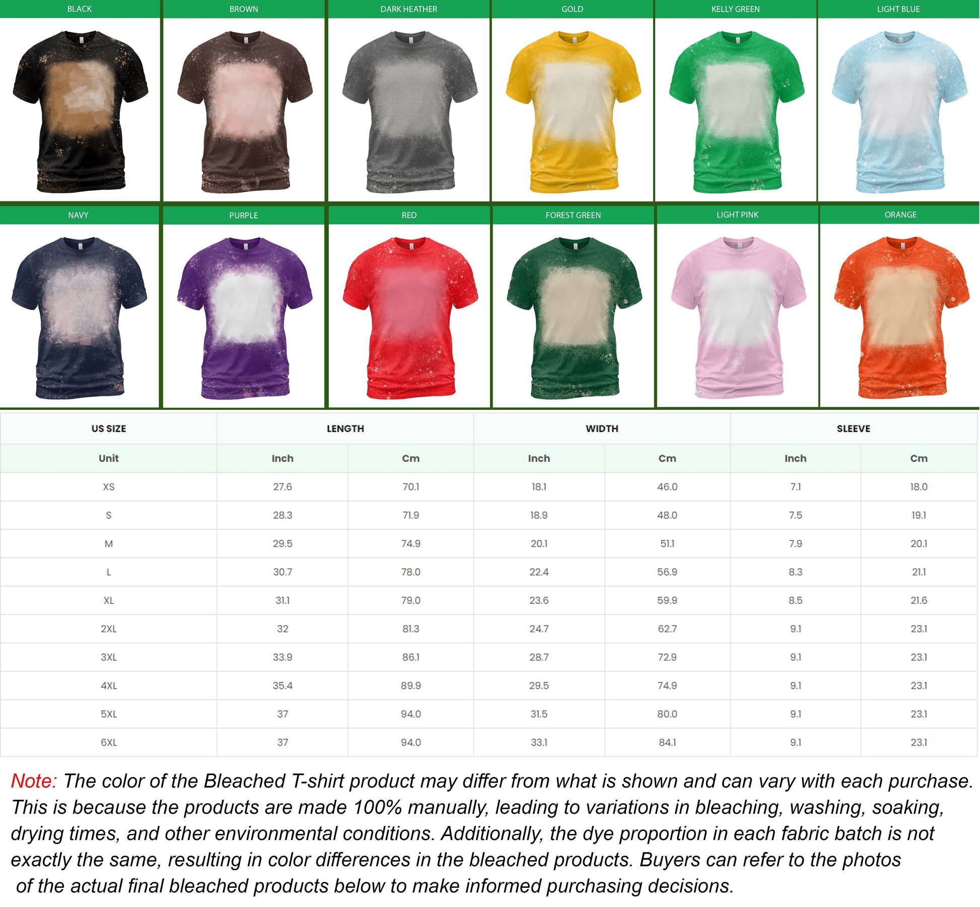 Note: The paint flake effect will be generated at random; there will be no specific pattern. Please note that the paint effect will not be identical to the sellers’ mockup. The size of the bleached area in the center of the shirt is not fixed; it will correlate to the design’s size. Please note that the bleached color of black, brown, and navy products will be yellow.