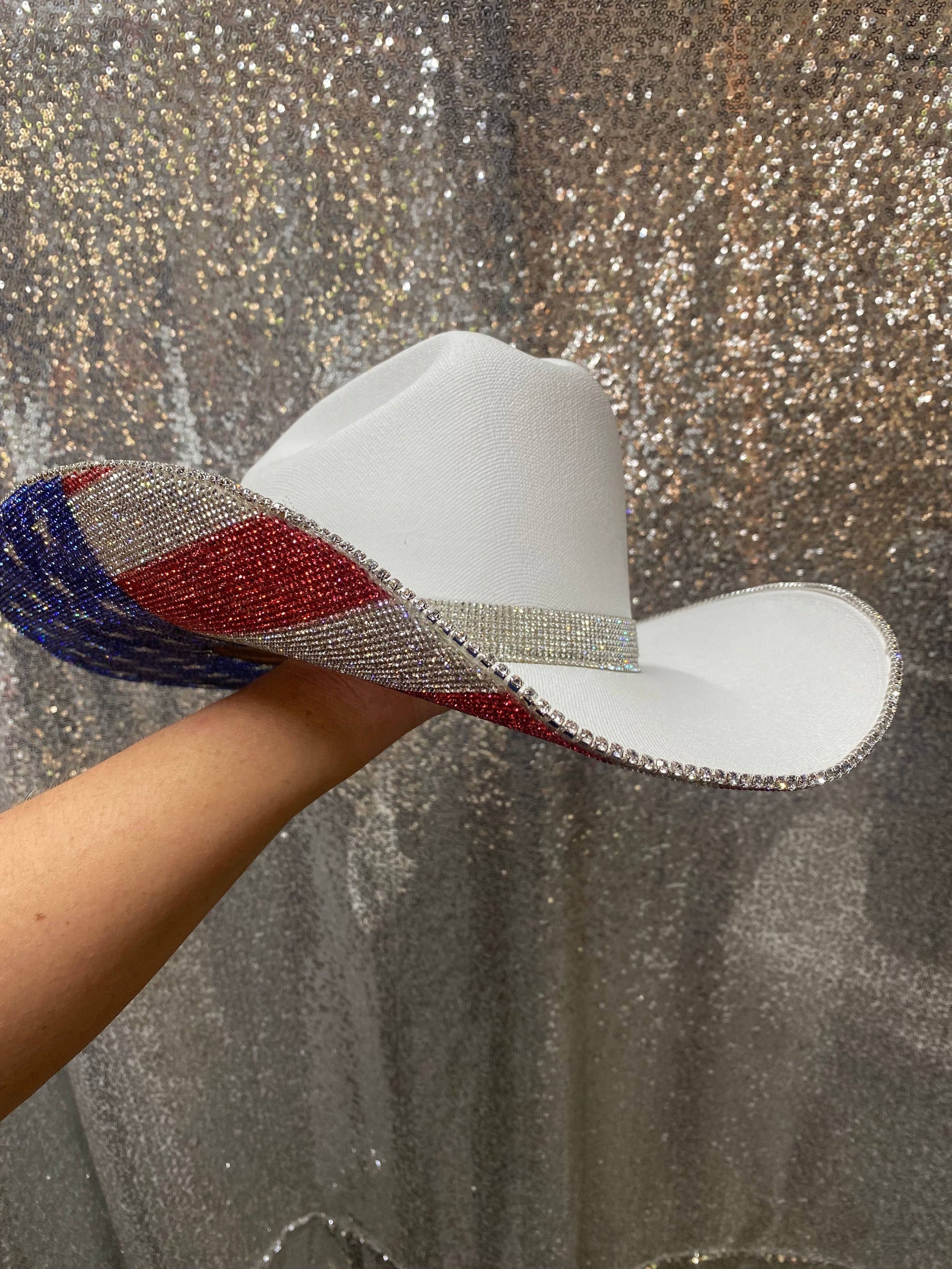 * Our white hats are a one size fits all! The band on the inside is a stretchy band; all orders come with a custom Rhinestone Cowgirl dust bag and foam pieces that can be stuck behind the hat band to reduce the size.