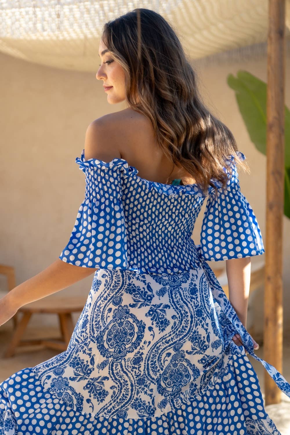Top strapless with honeycomb and ruffled sleeve in polysilk with polka dot print in Sunset & Moon blue color.